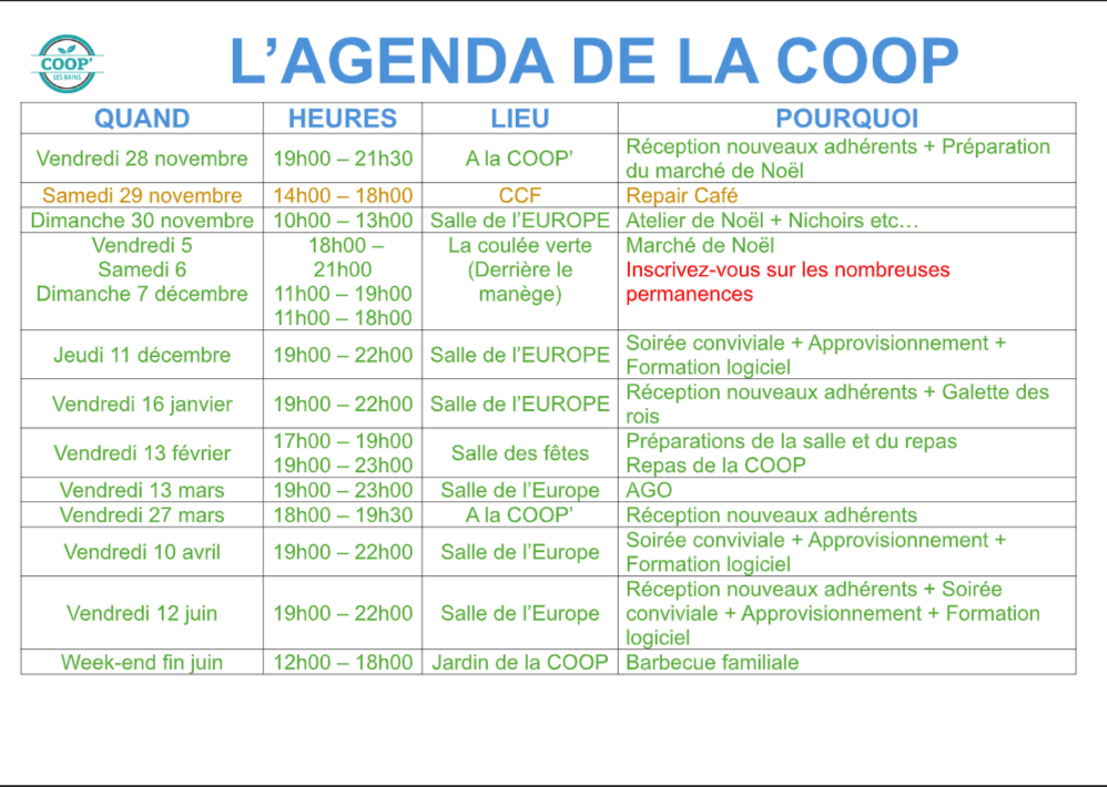 Faites connaissance avec d’autres coopérateurs lors d’un repas participatif, une visite chez un producteur ou bien en tenant notre stand au marché de Noël solidaire. Consulter l’agenda plus haut sur cette page ou nos pages sur les réseaux sociaux (Facebook, Instagram) pour le calendrier des événements à venir. Pour en savoir plus, contactez la commission animations